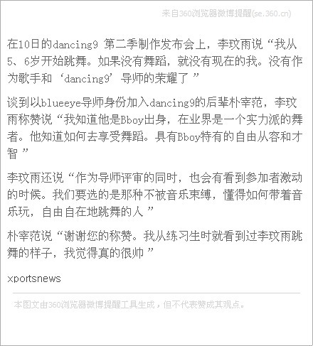 xsportsnews:在10日的dancing9 第二季制作发布会上,李玟雨说“我从5、6岁开始跳舞。如果没有舞蹈,就没有现在的我。没有作为歌手和‘dancing9’导师的荣耀了”