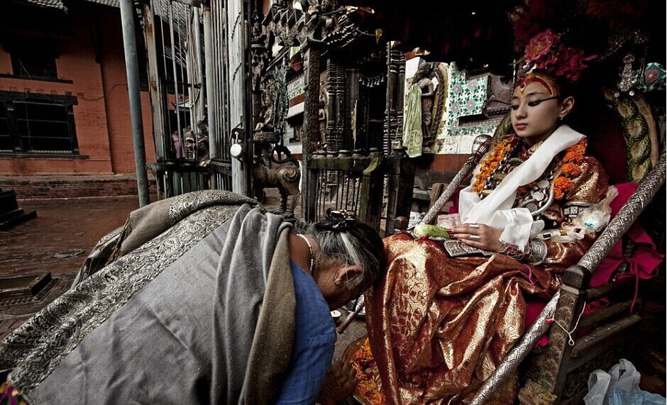 在很多国家女神更多是一种精神文明的象征,而在尼泊尔,令人崇敬的女神却是真实的存在。这些从出生起便经历多重挑选的童女叫做“库玛丽”,她们被认为是印度教女神迦莉的化身,一旦被赋予这一神秘且荣耀的光环,库玛丽就要接受成千上万印度教徒和佛教徒的朝拜,同样要接受的是她们注定孤独艰辛的一生。“库玛丽”,被迫离开他们的家园住进寺庙,除了一些特别的节日和宗教仪式,库玛丽大部分时间都住在庙宇里过着隐居的生活。由于库玛丽女神的特殊性,平日出行双足不能触地,库玛丽女神都改坐神轿或者由人抱着。