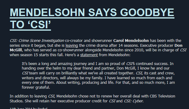 卡萝·门德尔松不再是CSI的showrunner,她从第一季就是showrunner了。