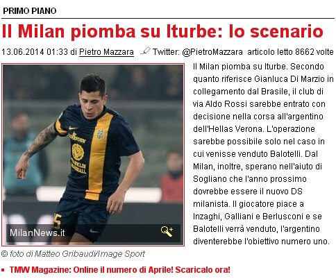连线身在巴西的迪马济奥称,米兰将加入维罗纳的阿根廷球员伊图尔韦的竞赛当中。同时他也表示,这项转会运作只有在出售巴洛特利的前提下才会进行,并且米兰方面也希望借此机会将维罗纳的经理索里亚诺在明年带入米兰。阿根廷新星是贝兔、家兔和因扎吉都喜欢的球员,一旦出售巴洛特利,伊图尔韦将是转会的首要目标。