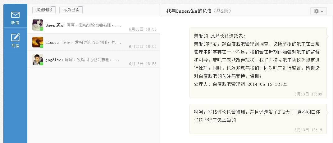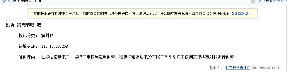 2、投诉理由:此吧主乱删帖乱封禁,很多人都被禁封,既没有违反吧规也没有进行辱骂,就是争论贴,争论不过或者没理由争论了就进行封ID,理由是挑事。本吧很多人不服气被封,出来抗议的也被封,也被删帖,并且争论站在吧主这一方的就可以随便出来骂人,并且很嚣张!!强烈表示抗议,本人已经投诉过了,但是投诉没有结果!