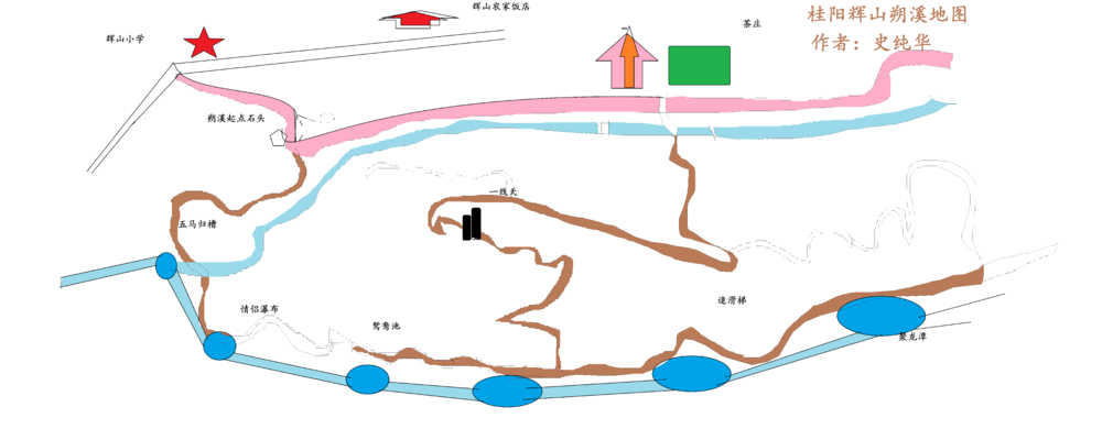 50多个队友出行吃饭依然是大问题,在之前我就联系了小朱要他帮我联系就餐的地方,实在不行的话我就会用我们的流动酒家。小朱是个扎扎实实的小伙子,立即帮我联系了农家乐。说是农家乐,只不过是在十几年前开矿盛行时的一个小饭店。由于数年没有营业,只留下来部分炊具和碗筷,崭新的“辉山农家饭店”大红招牌还是我们去的前一天才临时做好挂上的。虽然很久没有营业,但是老板的厨艺依然不减当年,土猪肉、土菜、神仙鱼和一壶壶自酿的白酒等令大家赞不绝口。饭后我们按原计划进行我们的朔溪活动。从饭店徒步2公里到达辉山峡谷(我自己暂时取名),满山遍岭的竹海犹如天然画卷。路旁一个巨大的天然石头犹如飞来之石竖立在路旁,石头边上长着一颗珍贵的植物犹如黄山迎客松。大家在石头前集体摄影留念。沿着新修的小路