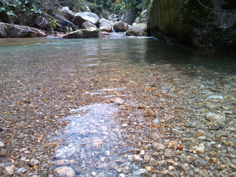 ,到达山谷,溪水清澈见底,边上植被茂密,怪石,瀑布,鸟鸣,看到此景,男同胞来不及脱下身上的衣服就急急忙忙跳入水中嬉戏先睹为快。那清澈的溪水,惟妙惟肖的石头,还有在桂阳难得一见的瀑布,构成一幅绝美的山水画,队友玩在其中,乐在其中久久不舍离开。沿着溪流走进大约1小时,是一片茶园,细心的主人把茶园、竹亭、竹桥、溪流和漫山的竹林紧密的规划,有如世外桃源。采茶、留影、欣赏茶叶加工工艺后大家就乘车返回,结束了短暂的辉山一日游。