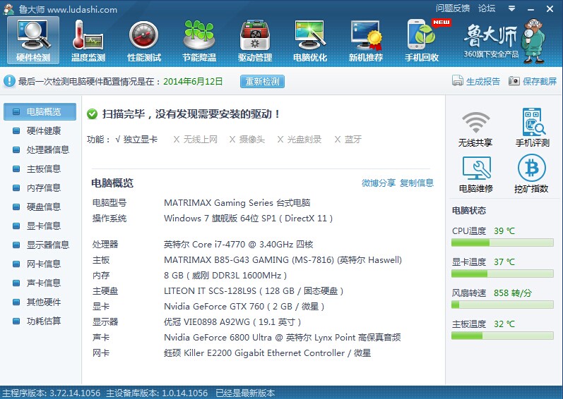 最后一张是游戏过程中鲁大师检测的电脑温度图~~~CPU和显卡温度基本在40上下,相当的低温……