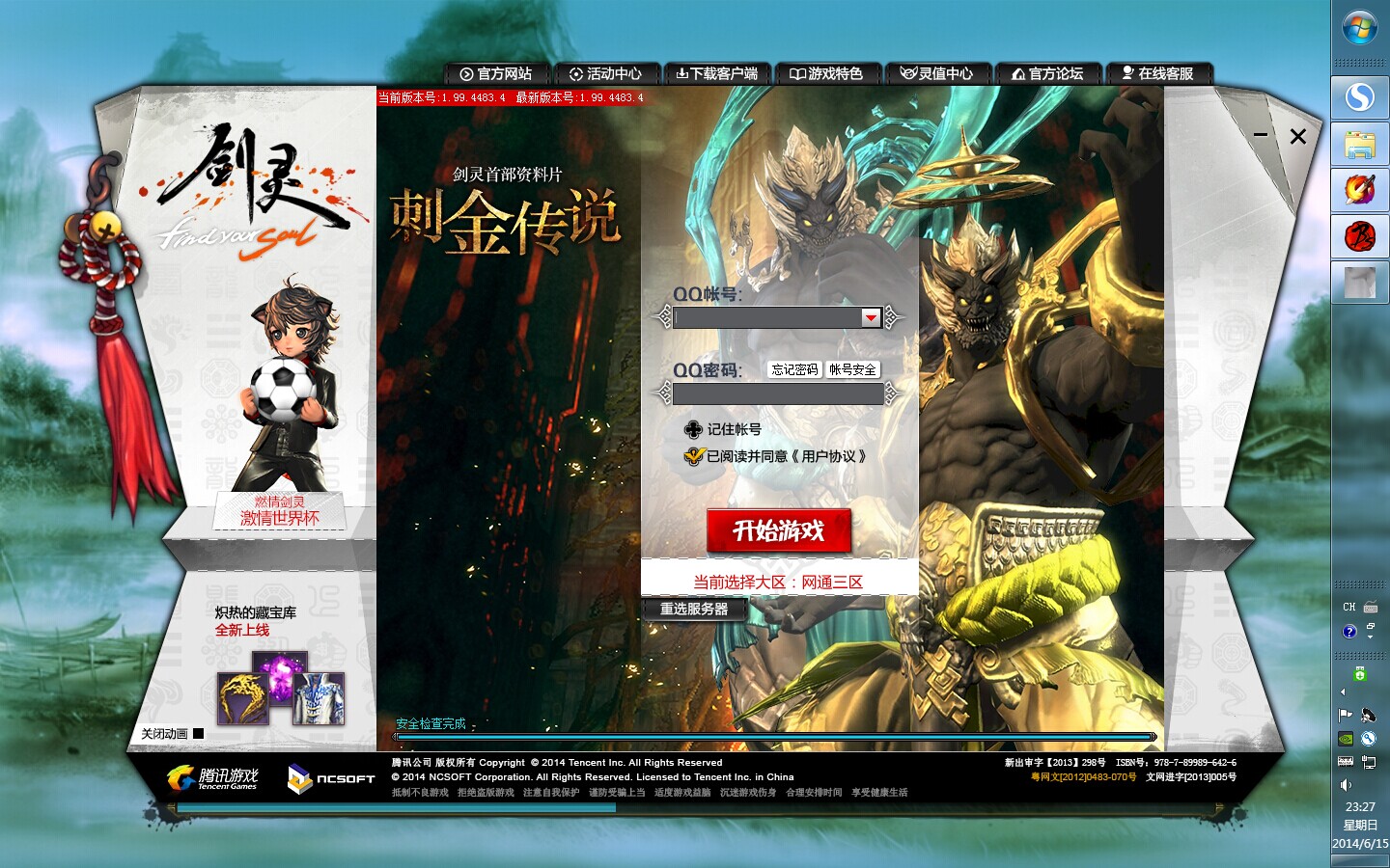 启动游戏进入游戏登陆页面~~,从任务栏上其实能看到,笔者不但开着剑灵,还同时在双开着剑网三这款网游,不但一点都不卡,启动游戏和读条都超迅速,测试时间为6月15日23:27~~
