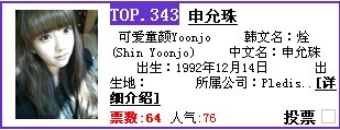 而且韩国女星涨幅不大,两个月过去了,宋茜貌似还是在原来的名次,我主要担心泰粉,泰粉有一年发威,快截止的时候硬是把徐贤从第二的位置拉到了五六名,所以能登上首页我就很满意了,我不求第一(因为我也知道不可能)
