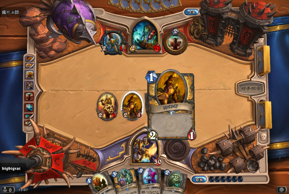 其实是这样的,当时有个飞刀,我5费上了飞刀,对面是一个图腾和一个2费的BUFF白狼,在上一个银色保卫者的时候飞刀扣了对面狼1点血,然后对面回合他用图腾在撞我的奥秘召唤出的坚持不泄触发飞刀秒了对面的白狼,结果就这样了,哈哈