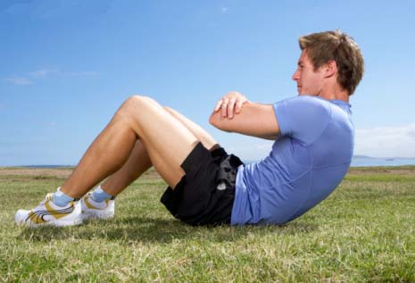 仰卧起坐可以直接针对腹部肌肉群,通过动作上的细微变化,使腹部不同部位的肌肉得到锻炼,最终达到塑型效果。最为常见的仰卧起坐方法是将身体处于仰卧状态,膝部屈曲成90°左右,脚部平放于地面,借助外力使之固定,然后利用腹部肌肉坐立起来。