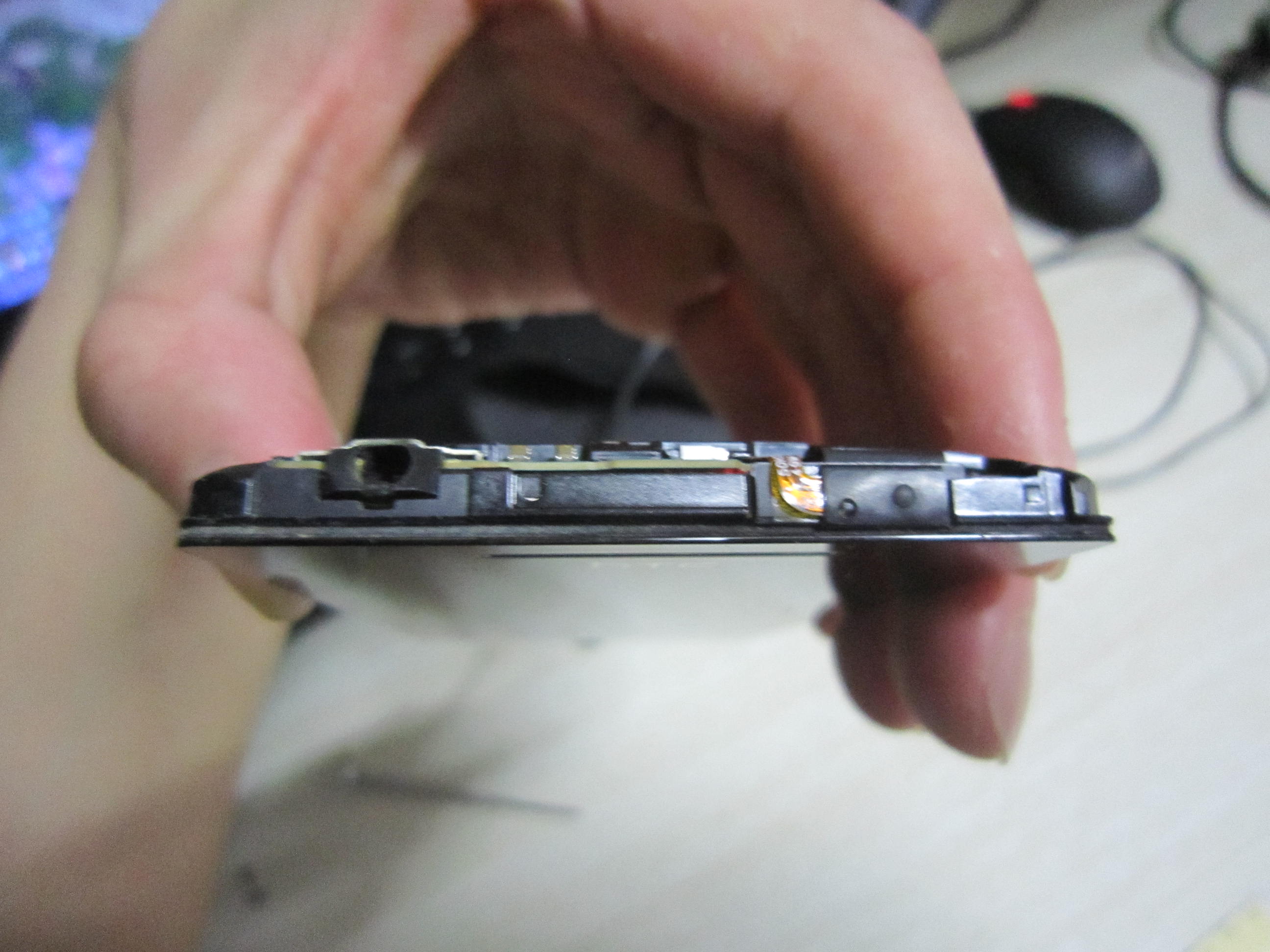 图中右边有一个小凸点,那个就是屏幕按键的关键位置了。起先我用透明胶在后壳上垫片那个地方垫了一层,装上后发现反而更难按了,拆开垫了两层,还是难用,再拆开换成纸片,纸片看厚度,我用的超市那种电脑小票,纸片叠4层,规格大概是0.5CM*1CM,放上去之后就爽歪歪了