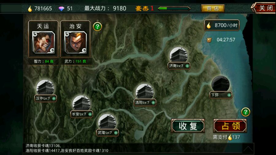 以前一直带着抽卡玩了,没有真正的核心,稀有卡就张辽一张,但可以走伪核张飞后宫或号令五骑(张飞两张),后宫大小乔等阵容齐全,金卡如下图,银卡一百多张,封地开了五个,现有的军令加邮箱里的差不多有一千左右。谁想诚心玩就白送了,只希望能善待一直玩下去。账号是安卓官网版的,无绑定,42区群雄割据