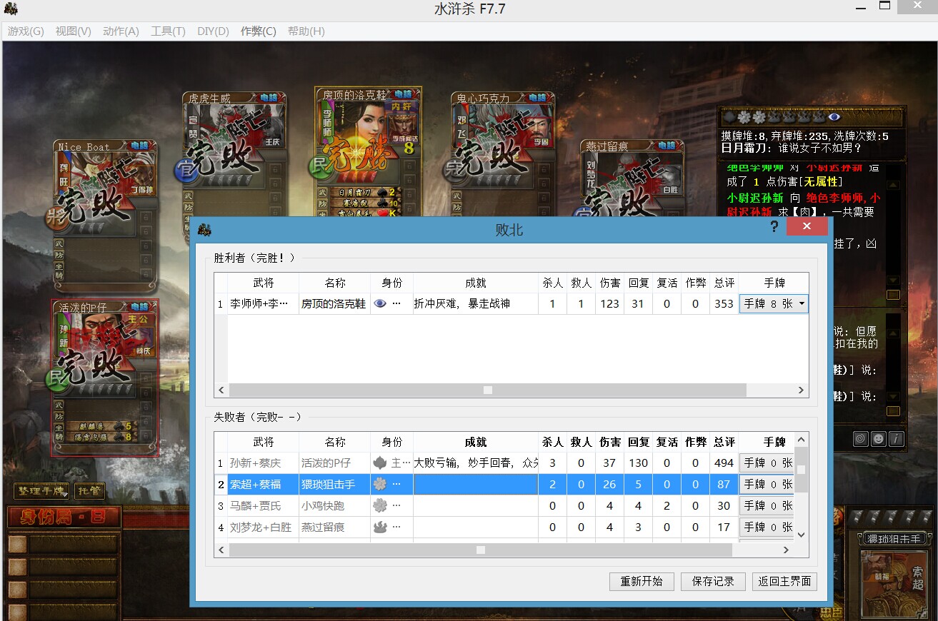 刚洗牌1次的时候还剩主公、我和小内,然后主公就把我砍死了。本来我还想等他结束,结果看了一会发现主公一直回血,要打很久的样子,就最小化让他们自己打,过了一会就这样了。