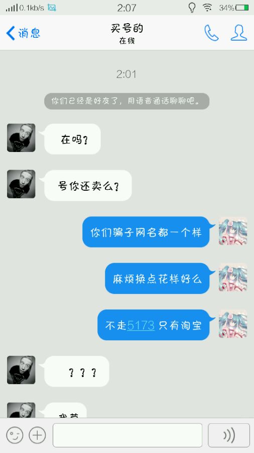结果来了大批5173骗子。。卖号的应该都知道 在这里提醒各位一下 网名叫买号的 申请验证是 我要买号 基本都是骗子而且骗子只会找理由走5173 大家千万别相信 下面呈上刚才于其中刚加我的一个骗子的对话。。。