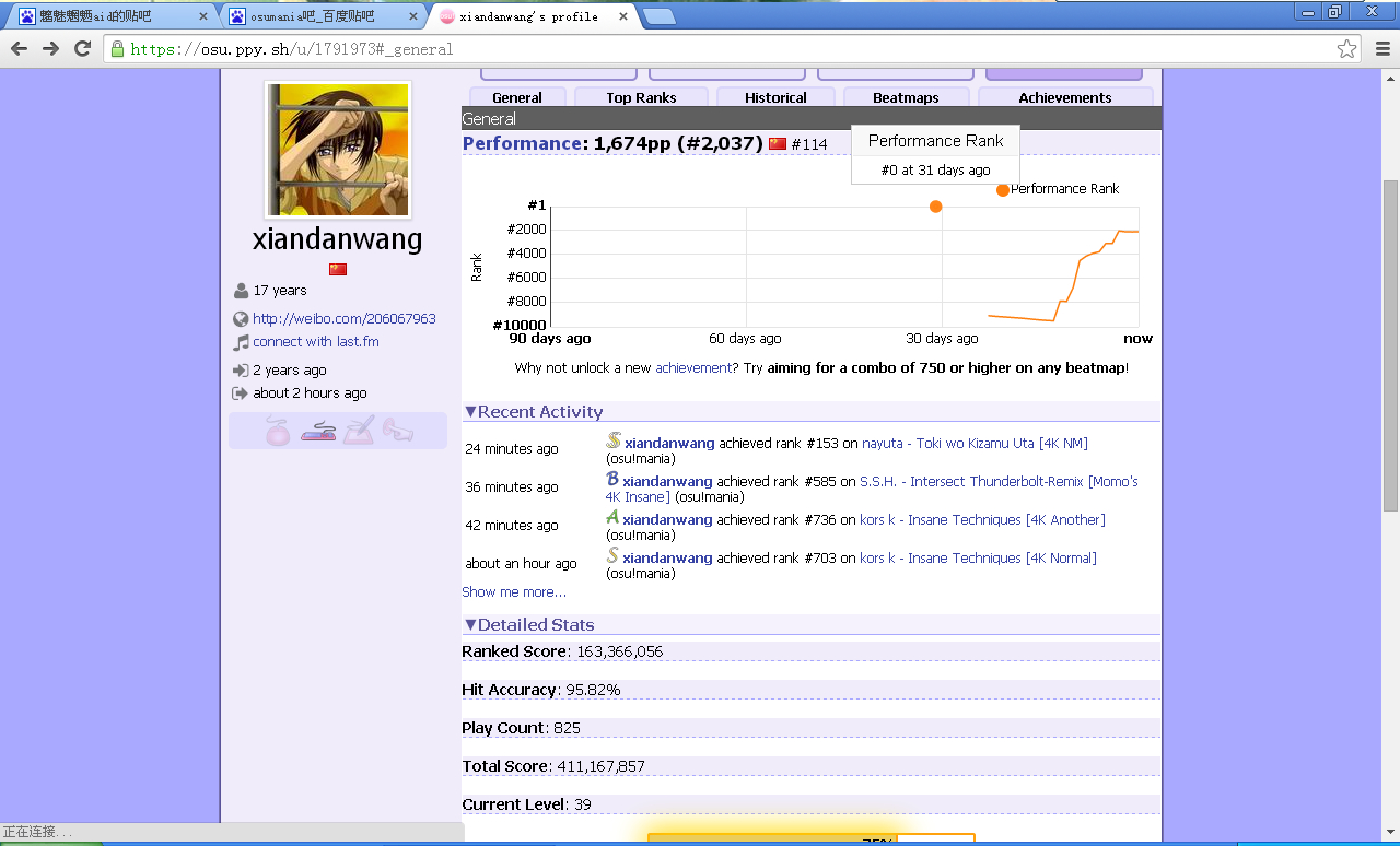 两年前就开始玩osu后来出了mania模式怒转坑,遇上高考又AFK了一段时间,磕磕绊绊走了这么久仍然是个渣