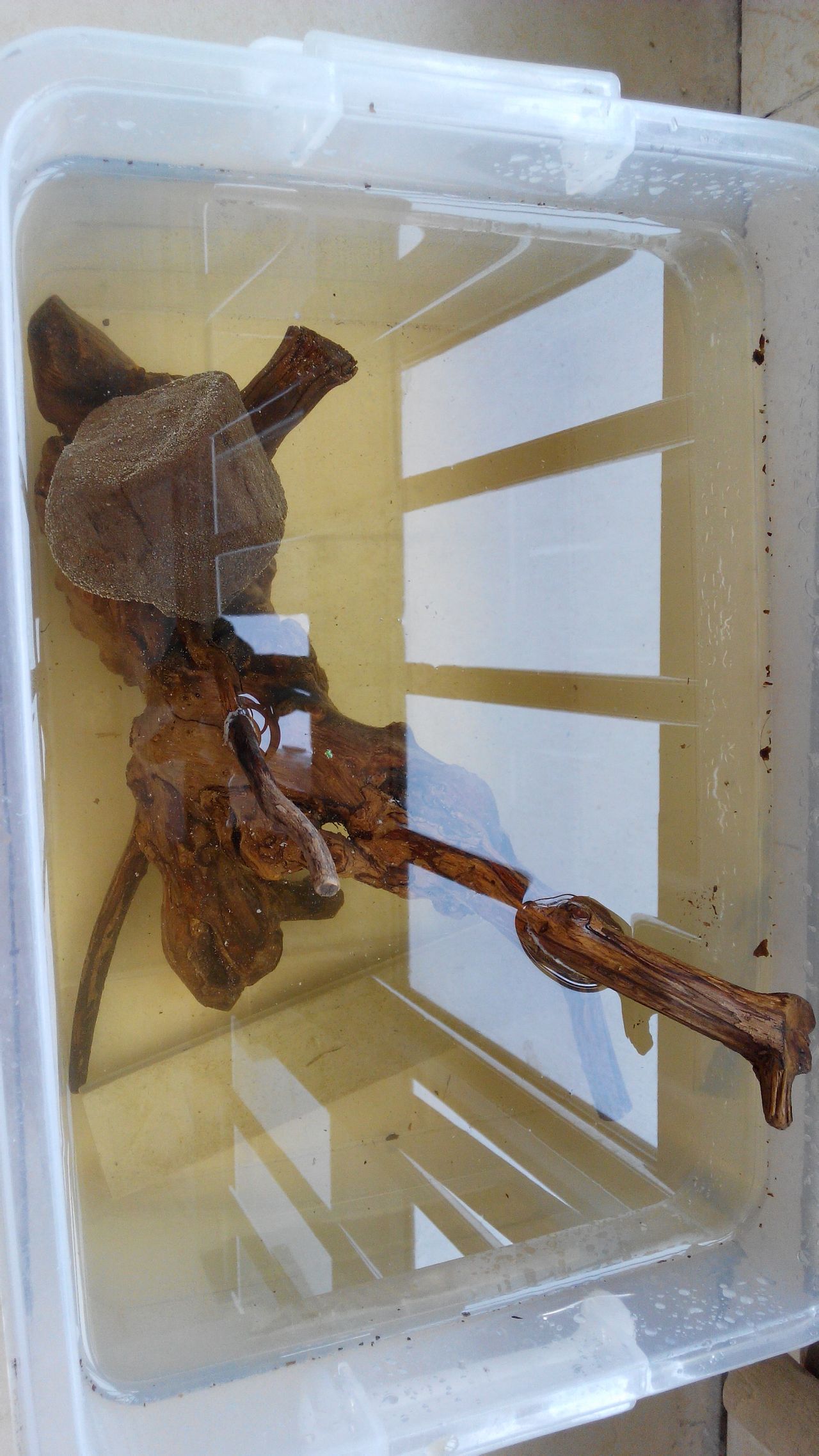 植物到了,放进去。周末去花鸟鱼虫市场买了一个小桥和宝塔。还有一个树根,店主说是荆柴的根,我觉得够重,泡上。
