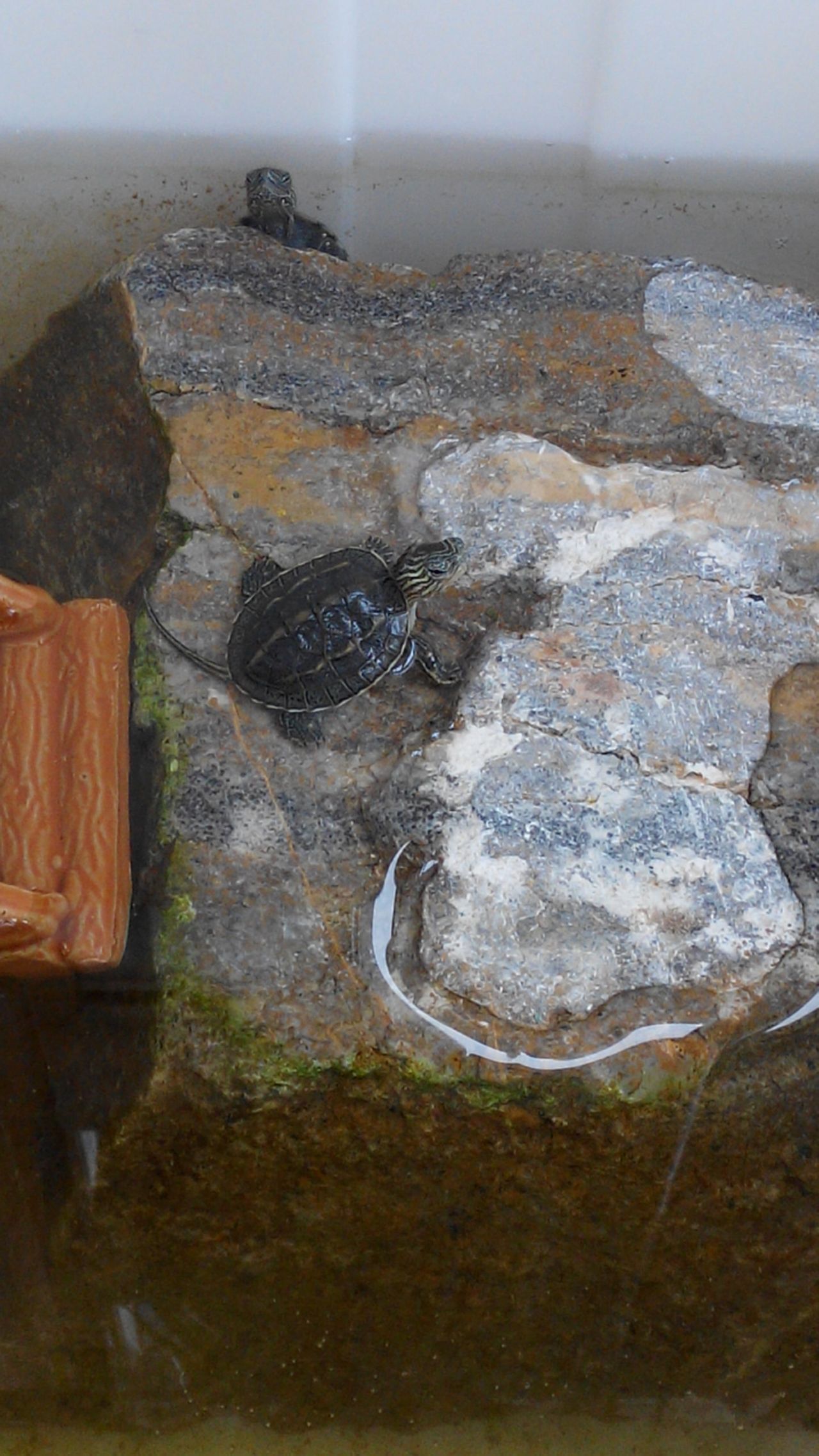 晒太阳中的柠檬。。。。俩巴天天藏到深水里,也不晒壳了,上面全是绿藻。。。