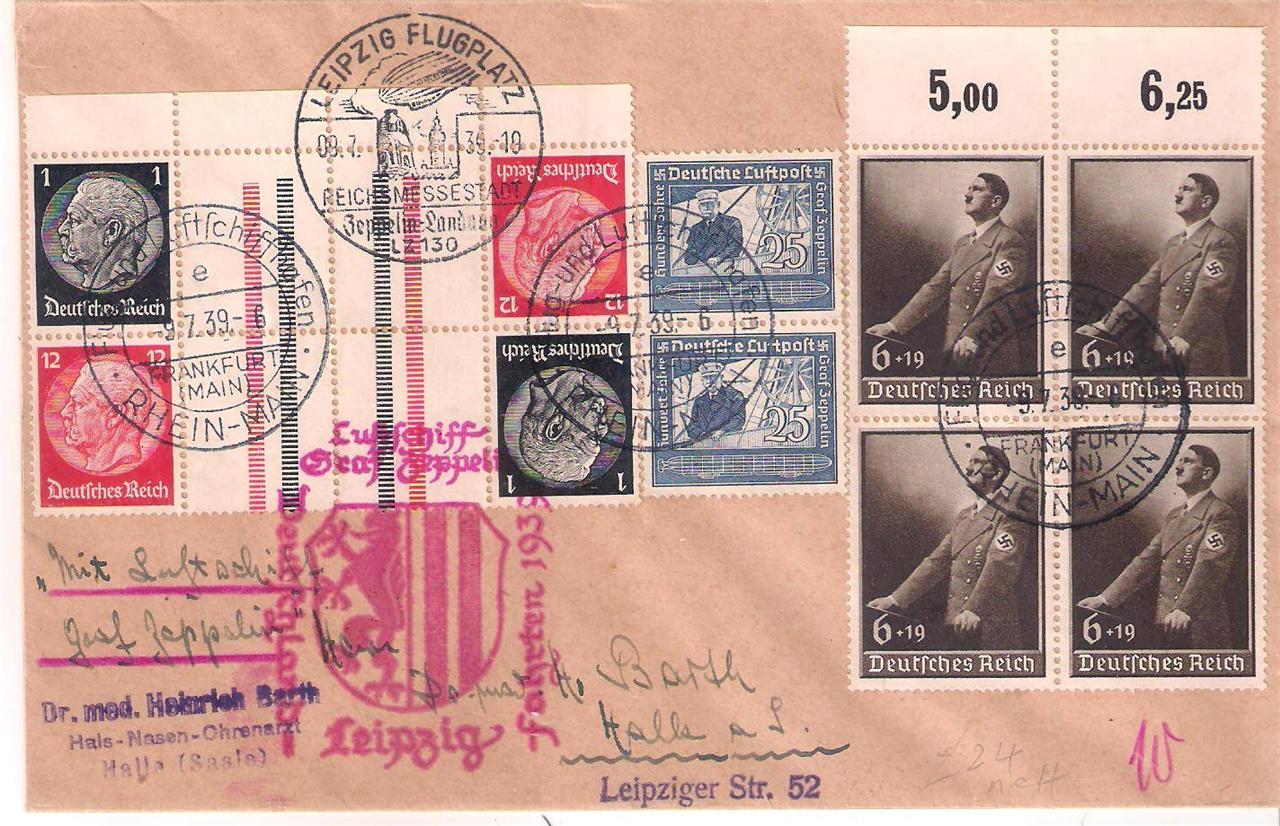 最近入手的两个航空封,齐柏林2号LZ130的末期飞行,离飞艇时代的终结不远了。3个名人的邮票同时出现在信封上,元首的方连、兴登堡的对倒加过桥外加齐柏林伯爵双联,能感受到当年做这个封的集邮者很有点意思。
