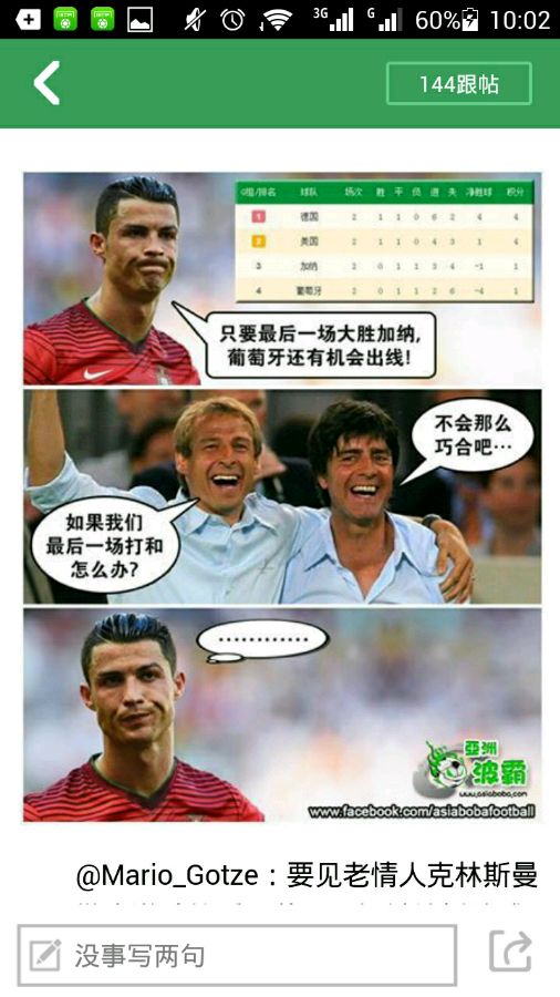 昨天买了德国…赛后, 我走上天台,对这个世界没有什么留恋了,纵身跃下…可我竟然没有死! 原来楼下躺满了买了意大利的朋友, 他们居然也没有死! 原来他们下面还躺着前天买英格兰的朋友,他们居然都没有死。。 因为下面还压了密密麻麻买了西班牙的朋友。。。