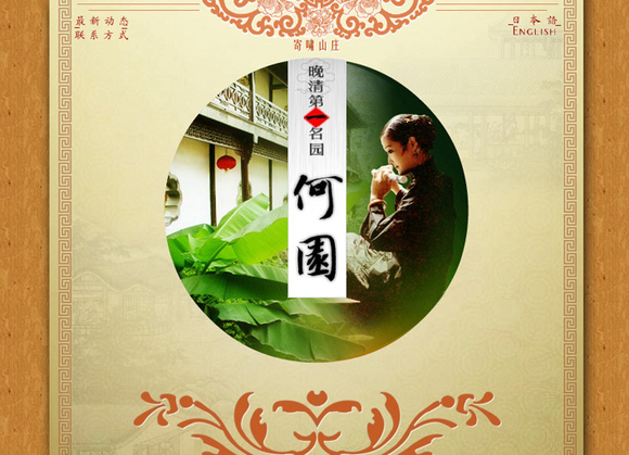 《何园》首页,方与圆的结合,也用到中国传统纹饰(上下的花纹及两侧的回纹)。