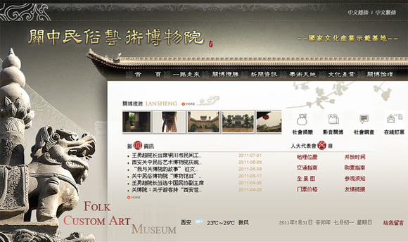 《关中民俗博物院》,花纹用得并不多但效果非常突出,传统建筑元素融入网页设计中。