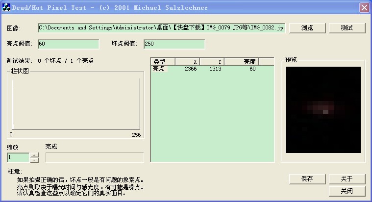 第二组照片是在ISO 100的情况下,快门分别1/125、1/60、1/15、1/2、1‘’、3.2‘’、15‘’、30‘’拍的照片,情况如下1/125、1/60、1/15、1/2、1‘’这五种快门情况下,坏点、亮点全为0
