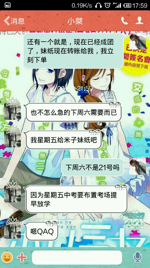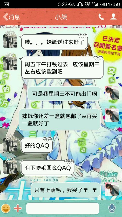 楼主前几个星期征集了假睫毛不知道大家记不记得,然后这货就+我了,然后要了8盒假睫毛,那时我还很高兴的想,酱紫就不用怕不成团啦,之后我叫妹纸转账,直接不理我,我又急着下单,于是我就自己先垫着钱,原本是21号面交的,不料楼主的坑爹学校放中考假了,然后提前了一个星期,然后面交的那天,坑爹的事情就开始了