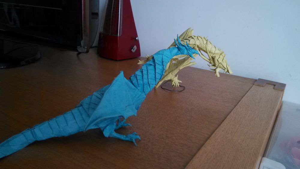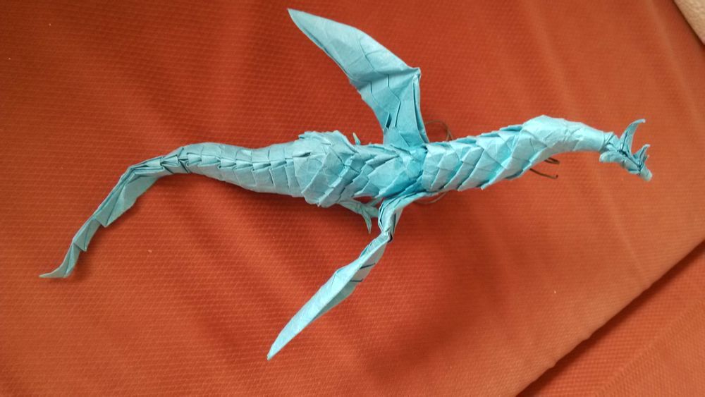 回复 现成2B :就把你设计的一条钱下来的鳞片分成两部分。分开点在翅膀的位置。折的时候做上下对接。