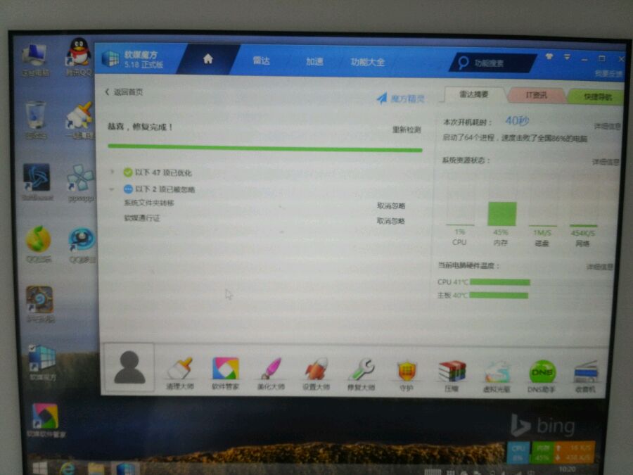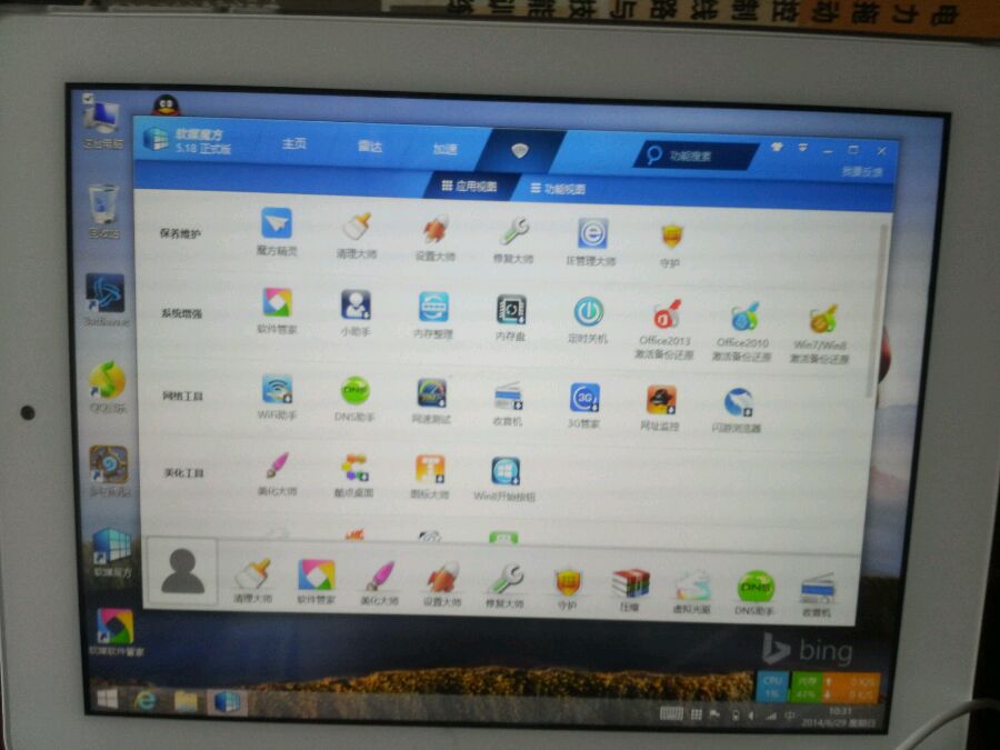 首先尽量不要安装360卫士360杀毒等安全软件,他们都比较吃内存,尽量不安装exe应用,因为硬盘太小,推荐安装平板应用,安全软件微软自带的defender足够了!辅助安全优化软件推荐软媒的魔方,这个软件不吃内存功能强大下面上图