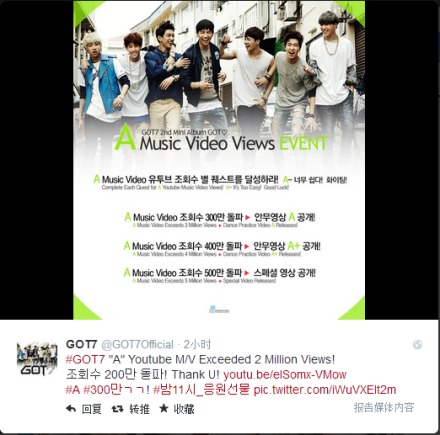[消息]【GOT7官推更新:#GOT7 "A" Youtube M/V点击率超过200万! Thank U! #A