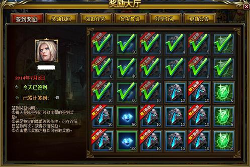 图1 十分凑巧的是,《剑与地下城》的通用货币正名叫“钻石”,所以在游戏中我们若发财致富,那就是真正的“钻石王老五”了。要赚钱首先在于坚持,哪怕是一些微不足道的小事。无论你学习工作有多忙,只有抽那么一分钟的时间登录游戏,就可以在签到界面获得海量的珍品奖励!其中在30天中每隔7天就可以获得大量钻石!从第一次20到最后100,总共300的钻石任你拿!不劳而获什么的最开心了!