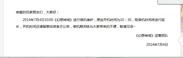 2014年7月5日12:00《幻想神域》各服务器将停止运用,感谢各位玩家对《幻想神域》的大力支持,敬请谅解。