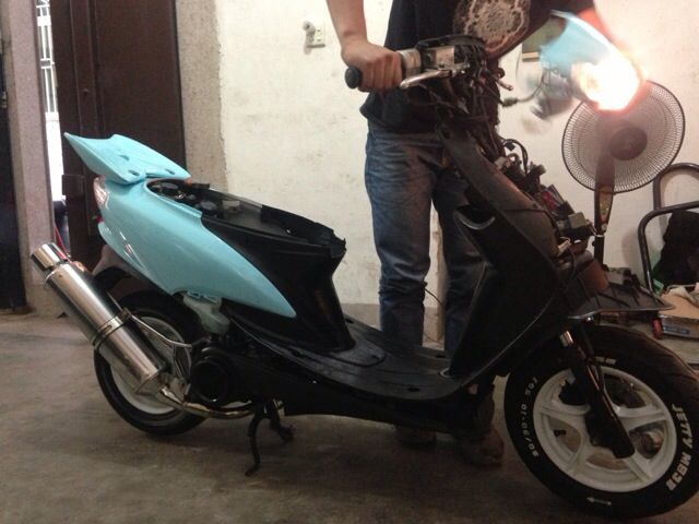 第二辆,zx34,上任车主一手水货,尸体整车朋友帮重做,翻新,其实最早买jog2的时候是在找zx,喜欢本田那个声哨,也喜欢zx的造型,可是好的车况可遇不可求,去看车都不满意,才买了jog2,这台车也动工了很久,朋友很用心在帮我,完成了蜕变,原车酒红,这台小改,然后就把jog2甩了