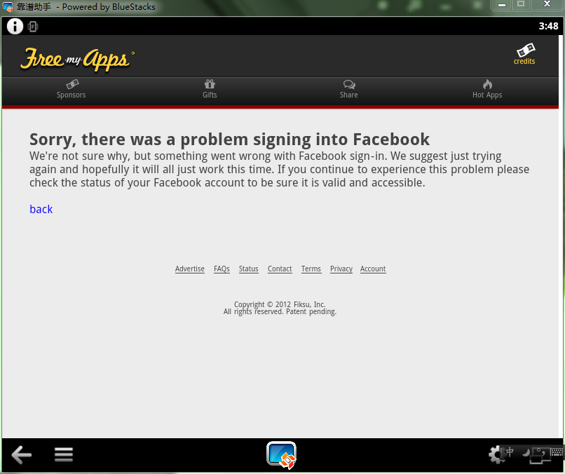 手机太热 想用模拟器刷的 下了freemyapps 绑定facebook的时候出现了这个是什么意思阿 手机用的face号 和新建的face都不行