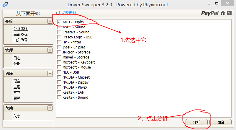 2、先使用DriverSweeper清理以前安装的AMD显卡驱动余留地注册表
