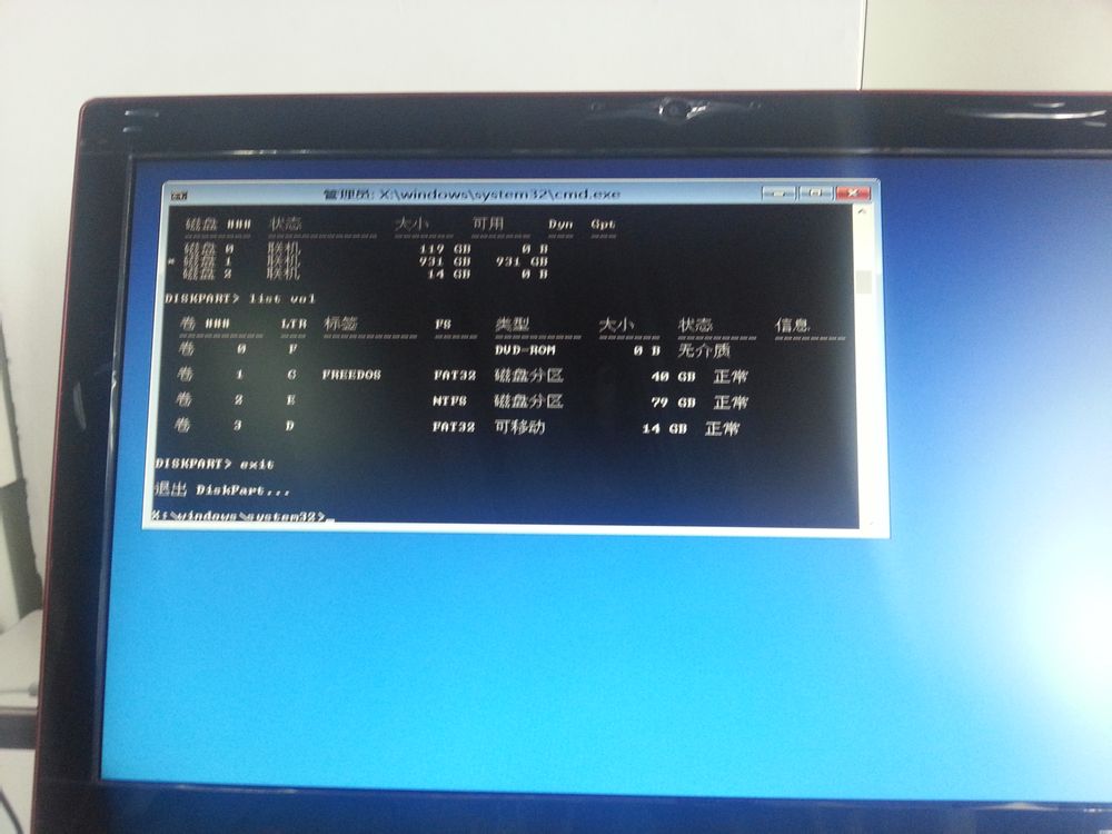 9、确认系统U盘所在的卷后,输入exit。