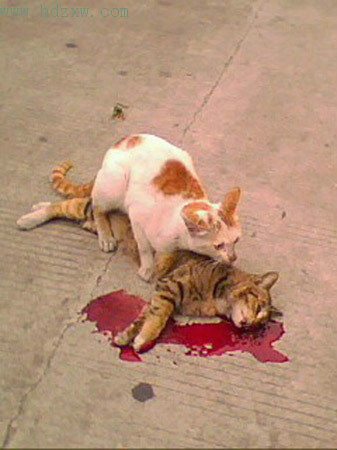 一只活猫,一只死猫,就这样偎依着,在马路中央,久久不散。围观的人都不敢上前,清洁工刚上前一步,就引来这只花猫凄厉的叫声。 公猫就像疯了一样,发出一声凄惨的叫声,然后就趴在母猫身上哀号。