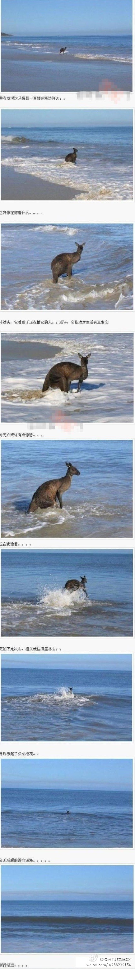 【自杀的袋鼠】在澳大利亚的一个海滩上,一名游客突然发现了这只抑郁的袋鼠,它在海边站立了好久,于是拿起相机拍摄,谁知看到的竟是让他都觉得不可思议的这一 幕......事后,据动物学家介绍,动物有时也会患上抑郁症,有些也会选择自杀的方式了结此生。动物都选择自杀