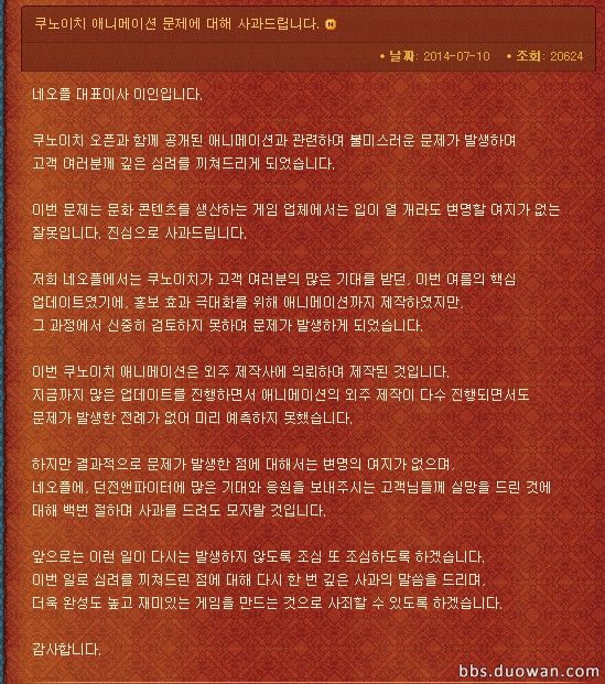 韩服官网上,NX就忍者宣传片出现抄袭现象的道歉公告