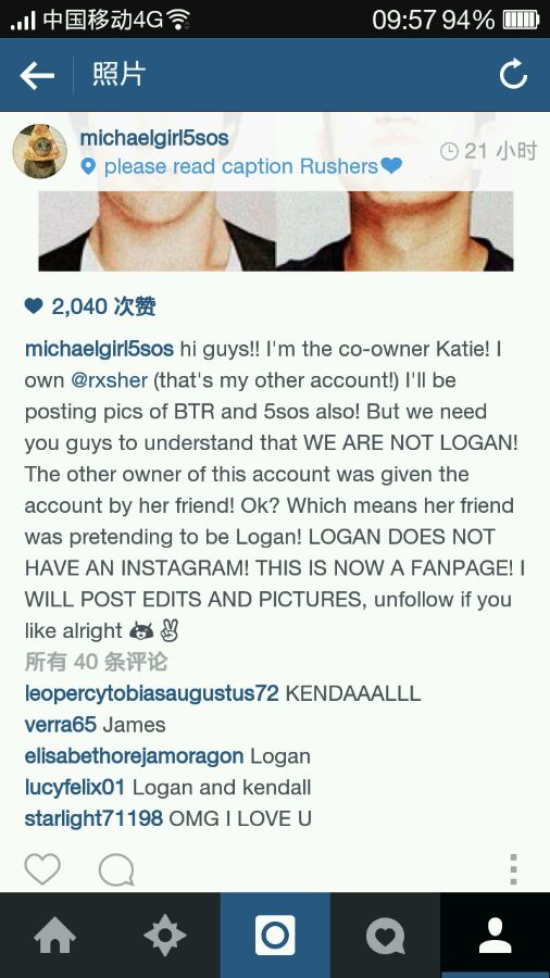 原文2:hi guys!! I'm the co-owner Katie! I own @rxsher (that's my other account!) I'll be posting pics of BTR and 5sos also! But we need you guys to understand that WE ARE NOT LOGAN! The other owner of this account was given the account by her friend! Ok? Which means her friend was pretending to be Logan! LOGAN DOES NOT HAVE AN INSTAGRAM! THIS IS NOW A FANPAGE! I WILL POST EDITS AND PICTURES, unfollow if you like alright