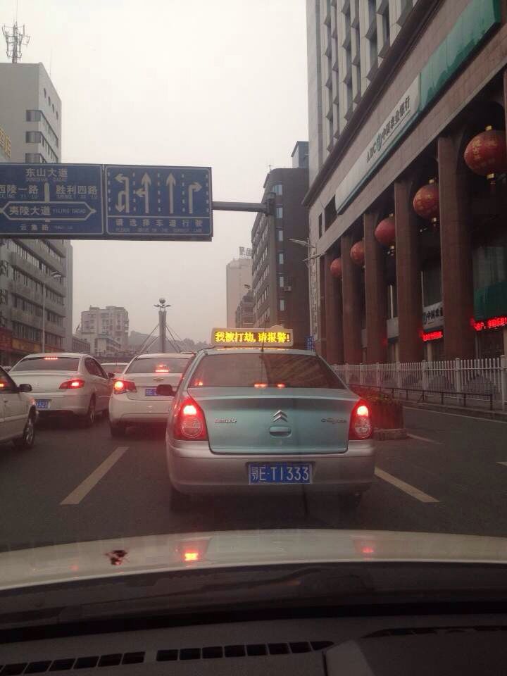今天在云集路上遇见的士打劫,一直打的双闪,最后发现的士的LED牌上写着打劫,报警了,警察说知道了…想知道后续发展,如果大家有微博的帮我扩散一下把,毕竟人家跑的士的也不容易啊,微博ID:小小苗苗啊