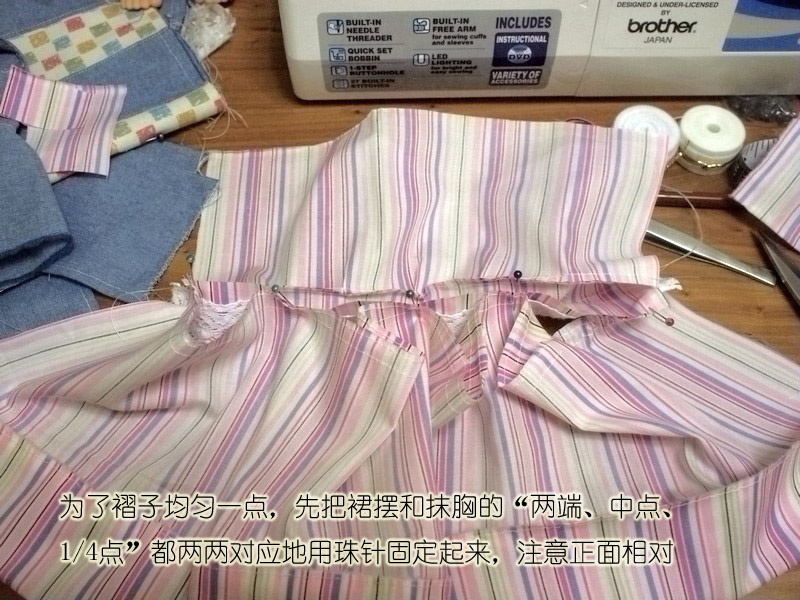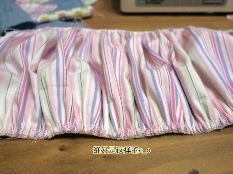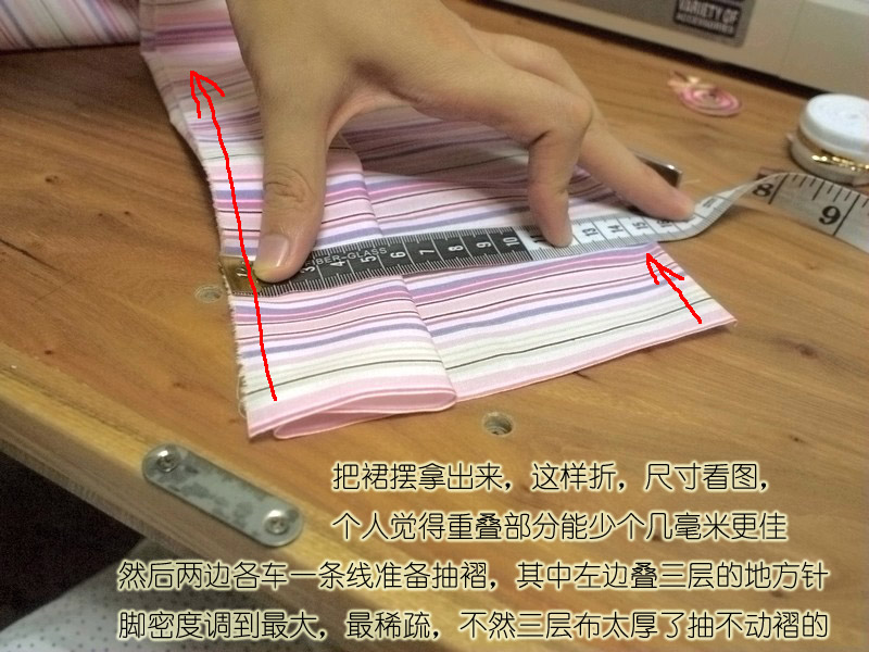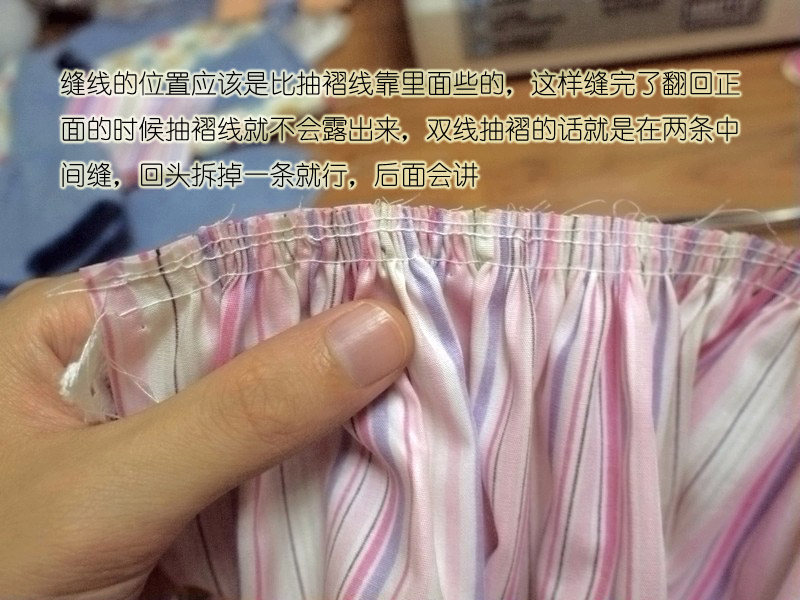 手缝也可以抽褶,疏缝一道然后抽紧到想要的长度,打个结固定,还可以用熨斗压一压褶子,定型了缝的时候就不会跑来跑去不均匀