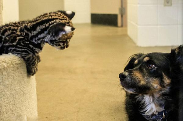 据辛辛纳提动物园的“脸谱”网介绍,桑托斯于11月2日出生于德克萨斯的阿比林动物园,由于得不到充足的母乳而转入了辛辛纳提动物园。在这里,它遇到了自己的好伙伴——布莱克利,一条帮忙照看小动物的狗。两个小伙伴一同度过了11周,几乎每天都形影不离。据工作人员称,小豹猫桑托斯将参加动物园猫科动物大使项目,而贝克力仍留在动物园履行自己的职责。