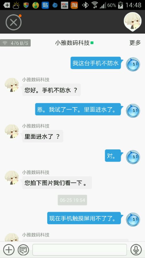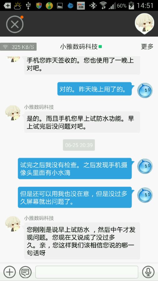心想这肯定是进水了。自己就找来电吹风想把手机吹干。断断续续吹了半天摄像头里的水汽基本上已经没有了。但是手机屏幕一点也没有改善,完全无法用了。可能是屏幕里面的水不容易吹出来。但是觉得还是要找卖家退货。应为花了3890买的防水手机不能防水,而且到货一天。晚上我就找到了卖家。