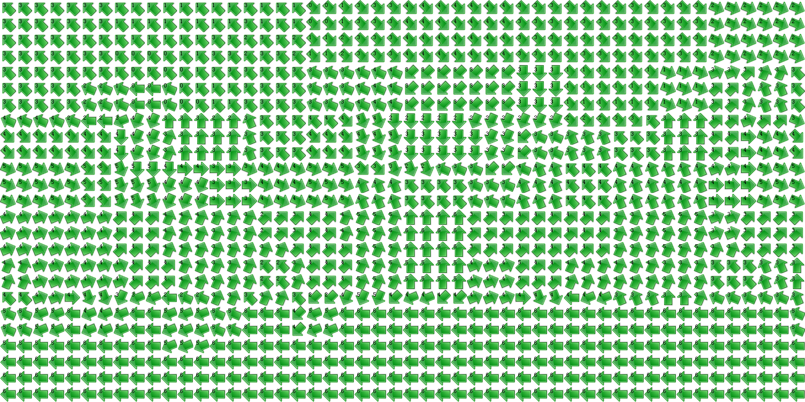 地图被分为50*25=1250个方块,每个方块内的季风(分上半年和下半年)和洋流的方向和强度如下(箭头代表方向,数字代表强度):