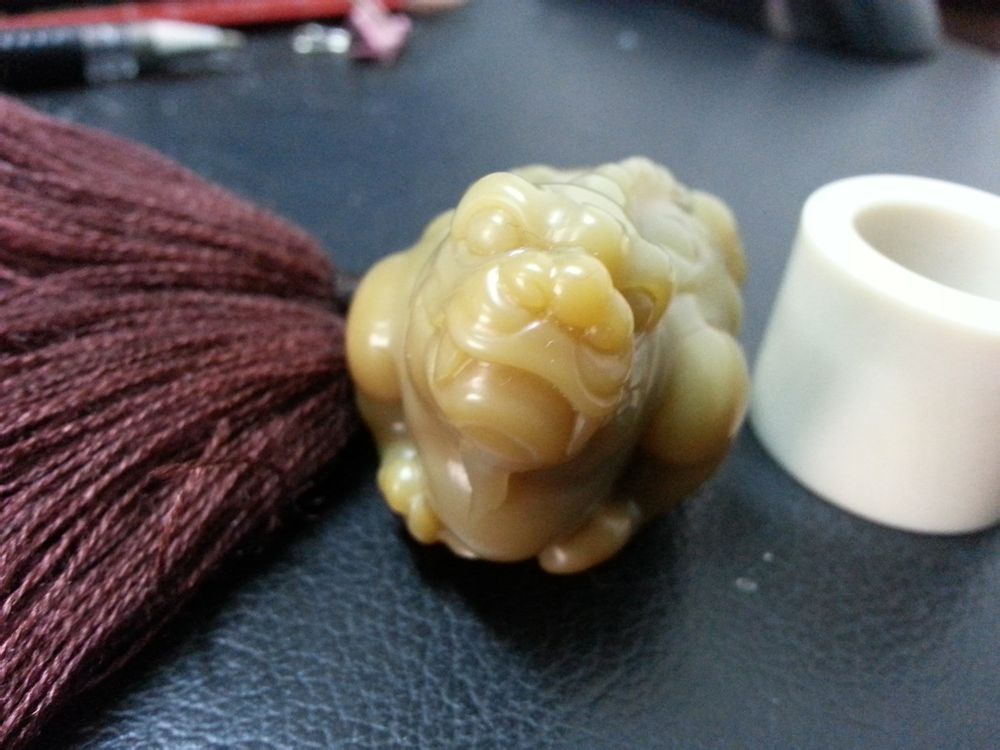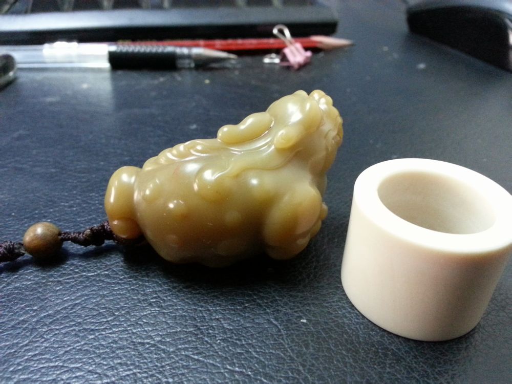 玩印石出身的我,真没想到会差点把最爱的印石抛弃了,呵呵,其实也不怪我,石头好的太贵差的看不上,哈哈,最近石市好像降了点温,于是入了这件难得的寿山老料掘性月尾绿,纯净,饱满,工一流,难得的佳品,哈哈,还有个小血料扳指