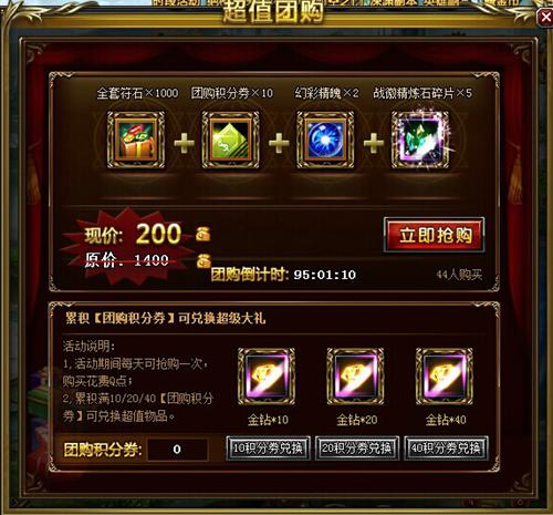 图3 超值团购,同样是点击游戏主界面上方同名图标进入界面,本次的超值团购商品极为丰厚,包括全套符石*1000,团购积分券*10,幻彩精魄*2和战徽精炼石碎片*5,这些都是在游戏中可遇不可求的珍品,在一般商店买不到,在神秘商店也很难刷出,而现在你只需要花费200Q,就可以全部拥有它们!这可是价值1400Q点的极品道具啊!而若你累积满足够的积分,还可以在界面下方兑换海量的金钻!如此优惠,你又怎能错过! 我们会和电影《后会无期》后会有期,刷完又再刷。我们还会与《剑与地下城》的南瓜派对和超值团购后会有期,它们将会一次次的出现,带给你更强更吸引的无尽惊喜!唯一后会无期的,或许只有某部喊出来都丢人的电影吧。Anyway,赶快进入游戏领取极致福利吧!