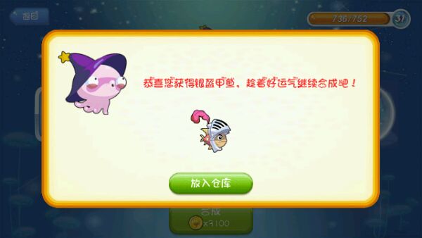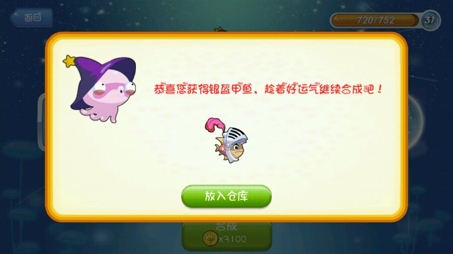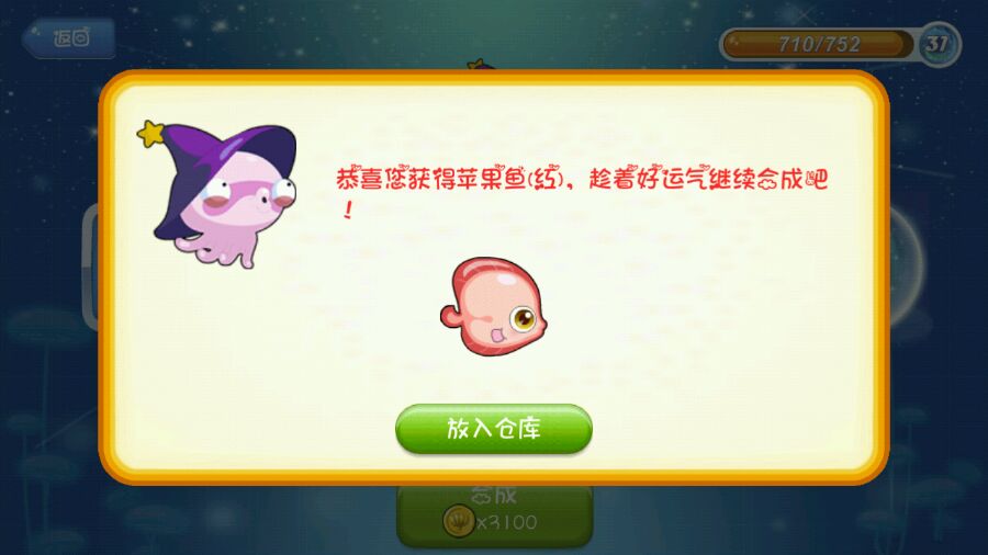 游戏等级49级,融合等级30级,除了耍融合等级外,经常瞎融合。好像安卓的融合是没有配方而言的,鱼都是随机的。晒晒我胡乱配方融到的鱼吧!等级不高鱼也不稀奇!大家也来晒晒自己用什么宝石融到什么鱼吧!