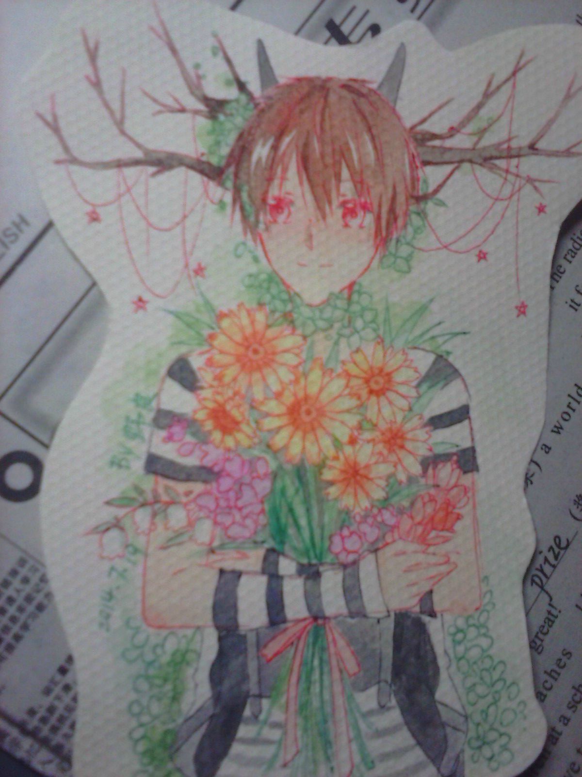 在再树枝上点缀了一些小星星~❀~,这样看不起不会太单调,大家如果有其他想法其他的装饰也可以画上去啦~再用红色圆珠笔画瞳孔!就完成啦!!!!!