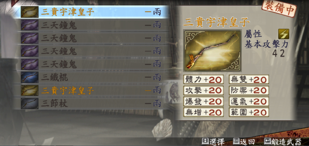 武器技能分为攻击、防御、范围、运气、体力、爆发、马术、移动等。每个槽子的技能最高数值为20,而一把武器上面同一个技能最高数值为60,即最多可以在武器上锻造3个最高数值为20的技能。只能是60,多了也没啥效果,45被改坏掉了大不了再刷一把嘛,当然了只要不是大馄饨、忠胜、谦信JJ的45,其他人的只要拿过一遍,就感觉没啥难度了。