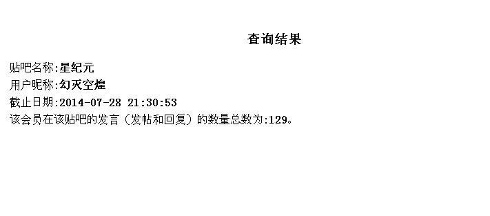 贴吧名称:星纪元 用户昵称:0度逆光 截止日期:2014-07-28 22:24:45 该会员在该贴吧的发言(发帖和回复)的数量总数为:2686。