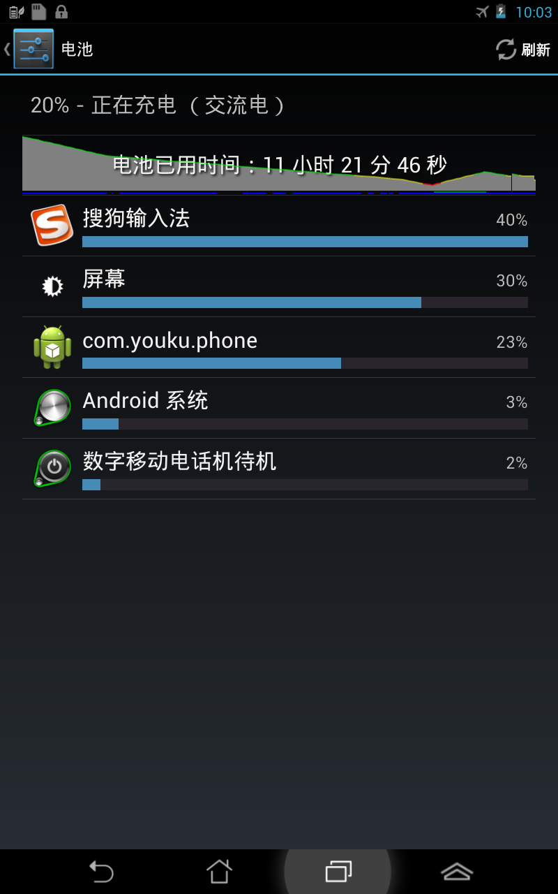 昨天坐火车用fonepad看电影,电掉得很快,查看耗电比例,恶心坏了。未联网状态,用优酷看已缓存的电影,结果搜狗输入法居然是耗电最大户。